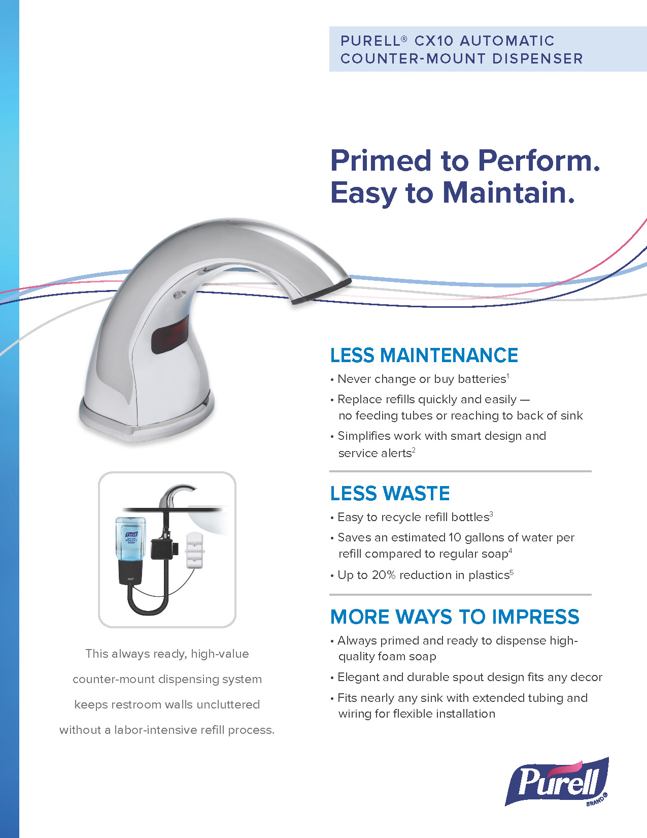 This always ready, high-value counter-mount dispensing system keeps restroom walls uncluttered without a labor-intensive refill process.